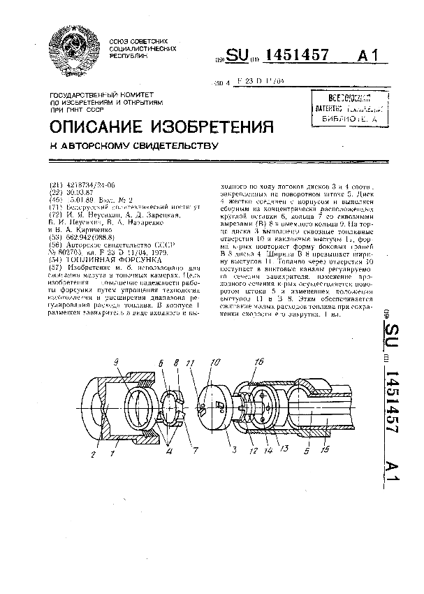 Топливная форсунка / Неусихин И. Я., Зарецкая А. Д., Неусихин Б. И. [и др.]; заявитель: Белорусский политехнический институт // Описания изобретений (ретрофонд) / Комитет по патентам и товарным знакам России. – М., 2003. – 1989, № 1. — (Патенты России). — Загл. с титул. экрана. — Поисковая система: ИПС MIMOSA GTI. — Систем. требования: Acrobat Reader. — Режим доступа: ftp://smolensklib.ru/bd/patent_ru/pt1451457.pdf. — <URL:ftp://smolensklib.ru/bd/patent_ru/pt1451457.pdf>.
