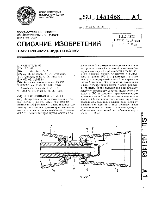 Ротационная форсунка / Сидоров М. И., Степанов Ю. Н., Сахаров П. А., Овчинников В. А. // Описания изобретений (ретрофонд) / Комитет по патентам и товарным знакам России. – М., 2003. – 1989, № 1. — (Патенты России). — Загл. с титул. экрана. — Поисковая система: ИПС MIMOSA GTI. — Систем. требования: Acrobat Reader. — Режим доступа: ftp://smolensklib.ru/bd/patent_ru/pt1451458.pdf. — <URL:ftp://smolensklib.ru/bd/patent_ru/pt1451458.pdf>.
