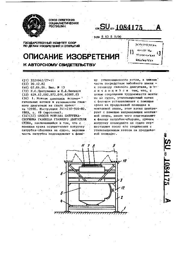 Способ монтажа патрубка-сборника газохода главного двигателя судна / Притуленко Н. С., Вшивцев Е. А. // Описания изобретений (ретрофонд) / Комитет по патентам и товарным знакам России. – М. — (Патенты России)., 2003. – 1984, № 1. — Загл. с титул. экрана. — Поисковая система: ИПС MIMOSA GTI. — Систем. требования: Acrobat Reader. — Режим доступа: ftp://smolensklib.ru/bd/patent_ru/pt1084175.pdf. — <URL:ftp://smolensklib.ru/bd/patent_ru/pt1084175.pdf>.