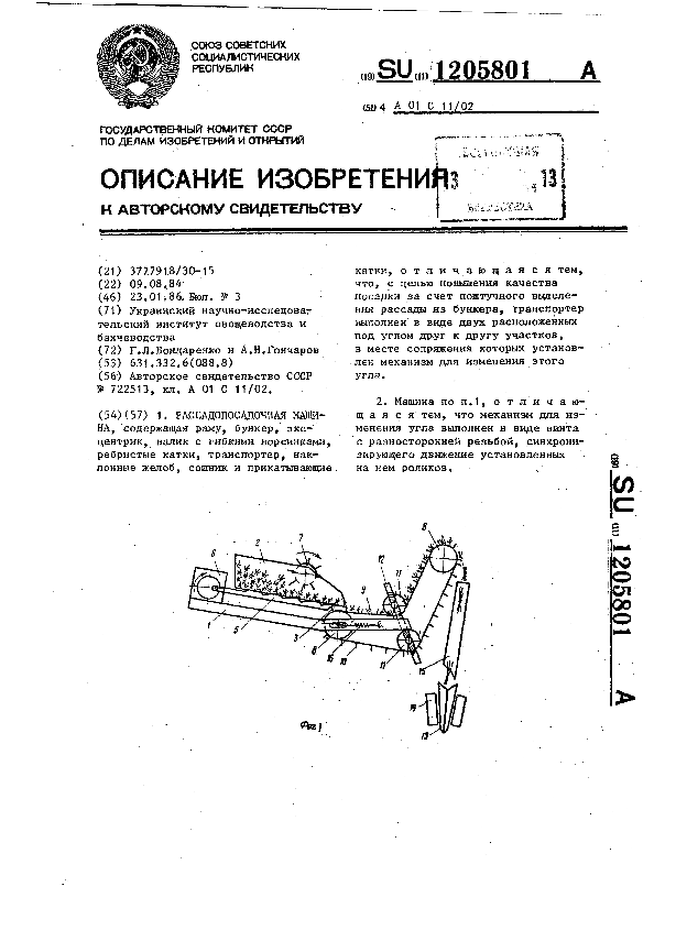 Рассадопосадочная машина / Бондаренко Г. Л., Гончаров А. Н.; заявитель: Украинский научно-исследовательский институт овощеводства и бахчеводства // Описания изобретений (ретрофонд) / Комитет по патентам и товарным знакам России. – М., 2003. – 1986, № 1. — (Патенты России). — Загл. с титул. экрана. — Поисковая система: ИПС MIMOSA GTI. — Систем. требования: Acrobat Reader. — Режим доступа: ftp://smolensklib.ru/bd/patent_ru/pt1205801.pdf. — <URL:ftp://smolensklib.ru/bd/patent_ru/pt1205801.pdf>.