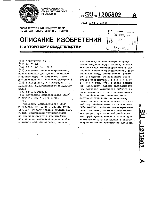 Разбрасыватель жидких удобрений / Горелик Г. М., Мащицкий Н. И., Пешко А. Е. [и др.]; заявитель: Головное специализированное, проектно-конструкторское технологическое бюро по комплексу машин для внесения органических удобрений // Описания изобретений (ретрофонд) / Комитет по патентам и товарным знакам России. – М., 2003. – 1986, № 1. — (Патенты России). — Загл. с титул. экрана. — Поисковая система: ИПС MIMOSA GTI. — Систем. требования: Acrobat Reader. — Режим доступа: ftp://smolensklib.ru/bd/patent_ru/pt1205802.pdf. — <URL:ftp://smolensklib.ru/bd/patent_ru/pt1205802.pdf>.