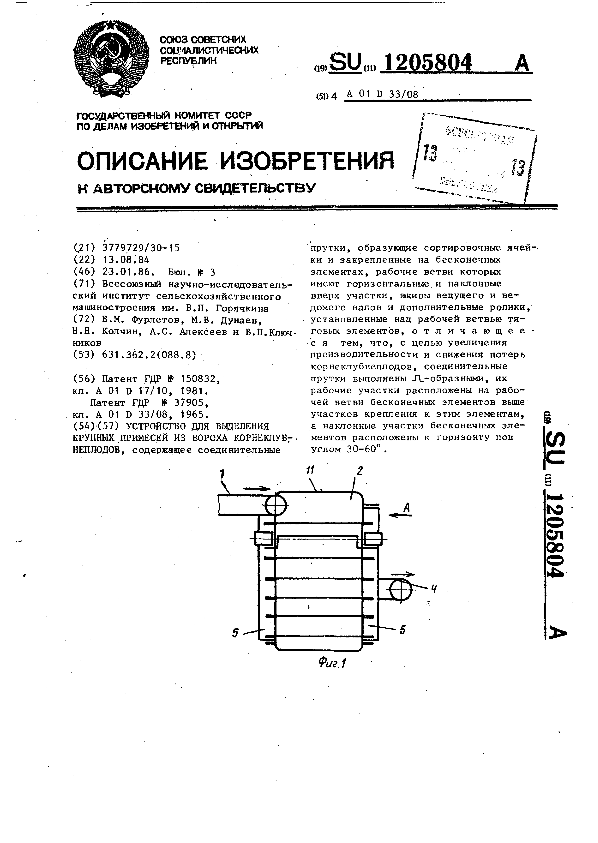 Устройство для выделения крупных примесей из вороха корнеклубнеплодов / Фурлетов В. М., Дунаев М. В., Колчин Н. Н. [и др.]; заявитель: Всесоюзный научно-исследовательский институт сельскохозяйственного машиностроения им. В. П. Горячкина // Описания изобретений (ретрофонд) / Комитет по патентам и товарным знакам России. – М., 2003. – 1986, № 1. — (Патенты России). — Загл. с титул. экрана. — Поисковая система: ИПС MIMOSA GTI. — Систем. требования: Acrobat Reader. — Режим доступа: ftp://smolensklib.ru/bd/patent_ru/pt1205804.pdf. — <URL:ftp://smolensklib.ru/bd/patent_ru/pt1205804.pdf>.