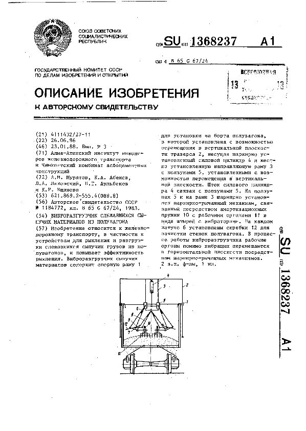 Виброразгрузчик слежавшихся сыпучих материалов из полувагона / Муратов А. М., Абенов К. А., Ляховский Л. А. [и др.]; заявитель: Алма-Атинский институт инженеров железнодорожного транспорта, Чимкентский комбинат асбоцементных конструкций // Описания изобретений (ретрофонд) / Комитет по патентам и товарным знакам России. — М., 1994-____. — (Патенты России). – 1988, № 1. — Загл. с титул. экрана. — Поисковая система: ИПС MIMOSA GTI. — Систем. требования: Acrobat Reader. — Режим доступа: ftp://smolensklib.ru/bd/patent_ru/pt1368237.pdf. — <URL:ftp://smolensklib.ru/bd/patent_ru/pt1368237.pdf>.