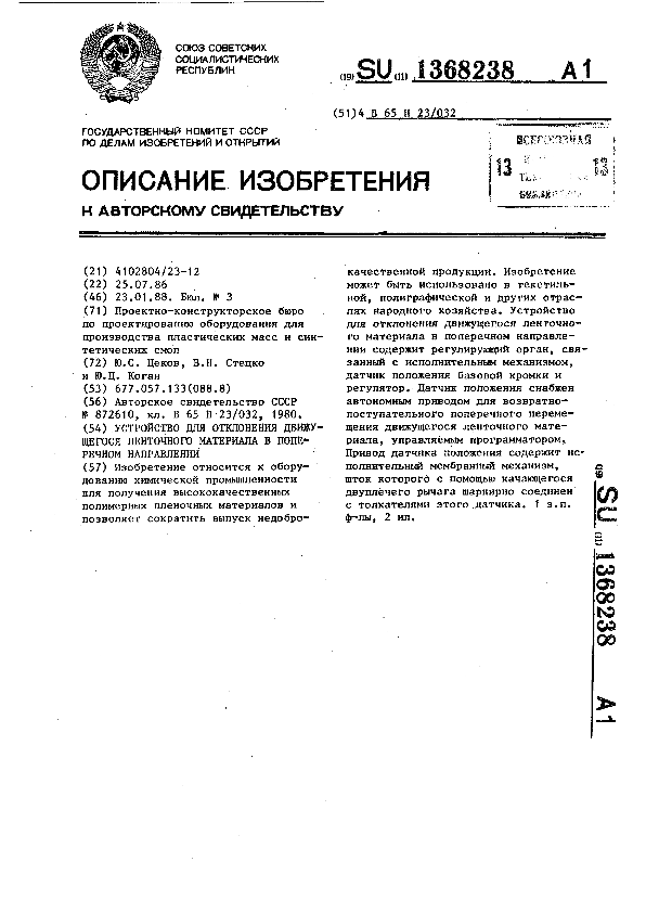 Устройство для отклонения движущегося ленточного материала в поперечном направлении / Цеков Ю. С., Стецко В. Н., Коган Ю. Д.; заявитель: Проектно-конструкторское бюро по проектированию оборудования для производства пластических масс и синтетических смол // Описания изобретений (ретрофонд) / Комитет по патентам и товарным знакам России. — М., 1994-____. — (Патенты России). – 1988, № 1. — Загл. с титул. экрана. — Поисковая система: ИПС MIMOSA GTI. — Систем. требования: Acrobat Reader. — Режим доступа: ftp://smolensklib.ru/bd/patent_ru/pt1368238.pdf. — <URL:ftp://smolensklib.ru/bd/patent_ru/pt1368238.pdf>.