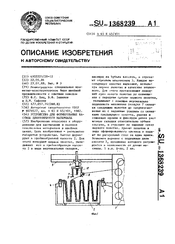 Устройство для формирования настила длинномерного материала / Кац Ф. С., Башилов В. Ф., Сафонов Л. М.; заявитель: Ленинградское специальное проектно-конструкторское бюро швейной промышленности с опытным заводом // Описания изобретений (ретрофонд) / Комитет по патентам и товарным знакам России. — М., 1994-____. — (Патенты России). – 1988, № 1. — Загл. с титул. экрана. — Поисковая система: ИПС MIMOSA GTI. — Систем. требования: Acrobat Reader. — Режим доступа: ftp://smolensklib.ru/bd/patent_ru/pt1368239.pdf. — <URL:ftp://smolensklib.ru/bd/patent_ru/pt1368239.pdf>.