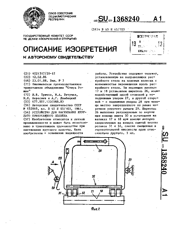 Устройство для настилания круглого трикотажного полотна / Тричко И. В., Бутучел М. А., Береснев И. Н., Дзюбецкий А. Г.; заявитель: Кишиневское производственное трикотажное объединение "Стяуа Рошие" // Описания изобретений (ретрофонд) / Комитет по патентам и товарным знакам России. — М., 1994-____. — (Патенты России). – 1988, № 1. — Загл. с титул. экрана. — Поисковая система: ИПС MIMOSA GTI. — Систем. требования: Acrobat Reader. — Режим доступа: ftp://smolensklib.ru/bd/patent_ru/pt1368240.pdf. — <URL:ftp://smolensklib.ru/bd/patent_ru/pt1368240.pdf>.