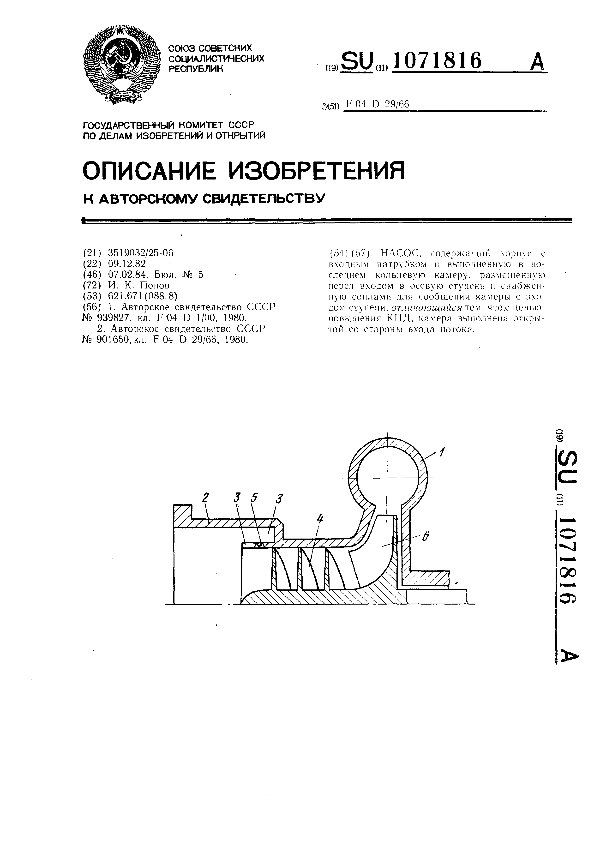 Насос / Попов И. К. // Описания изобретений (ретрофонд) / Комитет по патентам и товарным знакам России. – М. — (Патенты России)., 2003. – 1984, № 1. — Загл. с титул. экрана. — Поисковая система: ИПС MIMOSA GTI. — Систем. требования: Acrobat Reader. — Режим доступа: ftp://smolensklib.ru/bd/patent_ru/pt1071816.pdf. — <URL:ftp://smolensklib.ru/bd/patent_ru/pt1071816.pdf>.