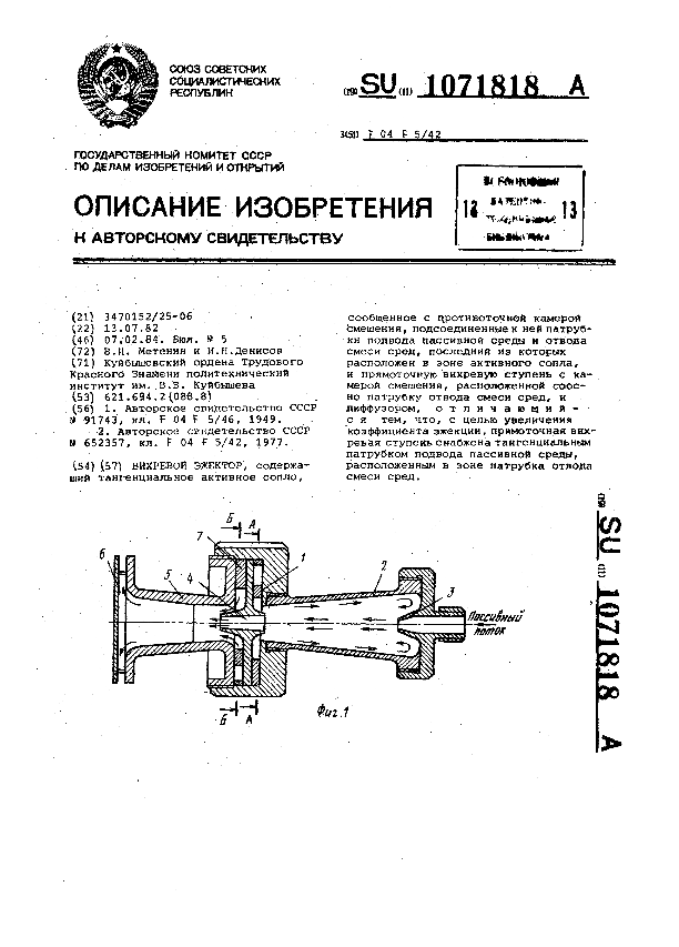 Вихревой эжектор / Метенин В. И., Денисов И. И.; заявитель: Куйбышевский ордена Трудового Красного Знамени политехнический институт им. В. В. Куйбышева // Описания изобретений (ретрофонд) / Комитет по патентам и товарным знакам России. – М. — (Патенты России)., 2003. – 1984, № 1. — Загл. с титул. экрана. — Поисковая система: ИПС MIMOSA GTI. — Систем. требования: Acrobat Reader. — Режим доступа: ftp://smolensklib.ru/bd/patent_ru/pt1071818.pdf. — <URL:ftp://smolensklib.ru/bd/patent_ru/pt1071818.pdf>.