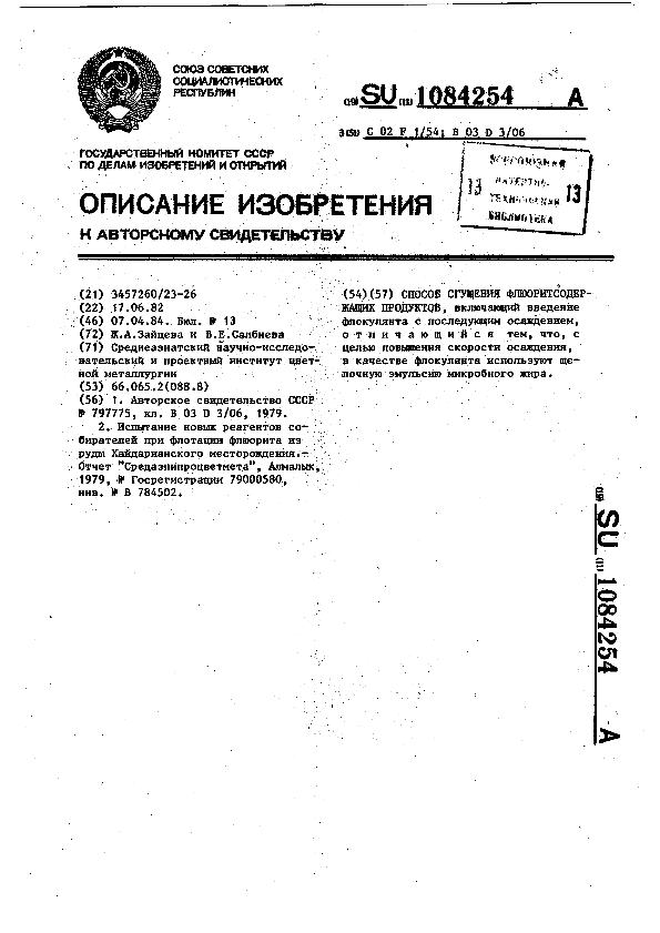 Способ сгущения флюоритсодержащих продуктов / Зайцева Ж. А., Салбиева В. Е.; заявитель : Среднеазиатский научно-исследовательский и проектный институт цветной металлургии // Описания изобретений (ретрофонд) / Комитет по патентам и товарным знакам России. – М. — (Патенты России)., 2003. – 1984, № 1. — Загл. с титул. экрана. — Поисковая система: ИПС MIMOSA GTI. — Систем. требования: Acrobat Reader. — Режим доступа: ftp://smolensklib.ru/bd/patent_ru/pt1084254.pdf. — <URL:ftp://smolensklib.ru/bd/patent_ru/pt1084254.pdf>.