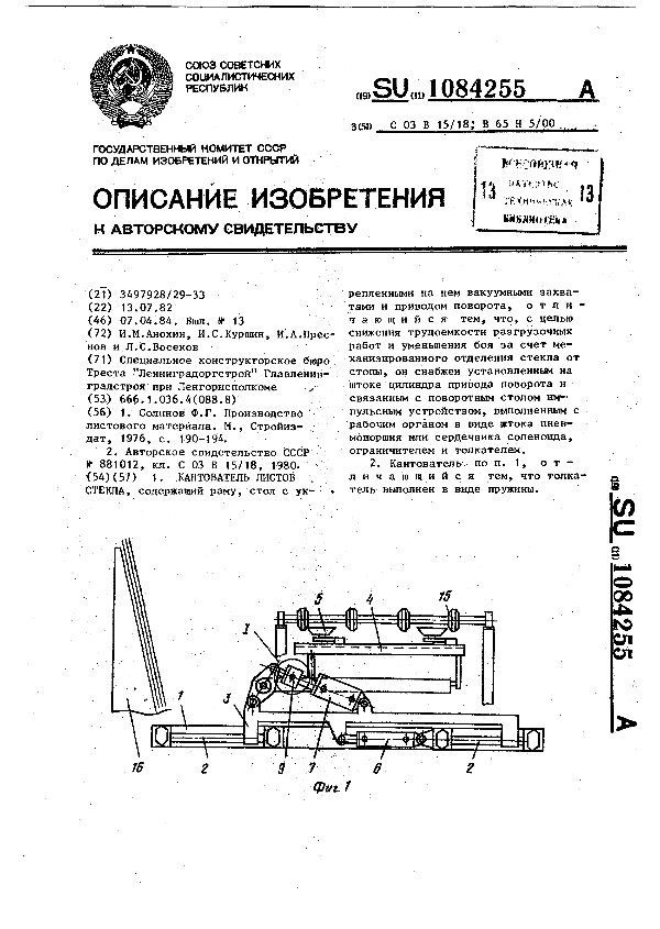 Кантователь листов стекла / Анохин И. М., Куршин И. С., Преснов И. А., Восеков Л. С.; заявитель : Специальное конструкторское бюро Треста "Ленинградоргстрой" Главленинградстроя при Ленгорисполкоме // Описания изобретений (ретрофонд) / Комитет по патентам и товарным знакам России. – М. — (Патенты России)., 2003. – 1984, № 1. — Загл. с титул. экрана. — Поисковая система: ИПС MIMOSA GTI. — Систем. требования: Acrobat Reader. — Режим доступа: ftp://smolensklib.ru/bd/patent_ru/pt1084255.pdf. — <URL:ftp://smolensklib.ru/bd/patent_ru/pt1084255.pdf>.