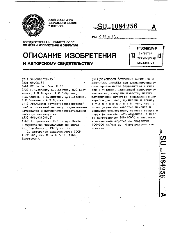Способ получения высокоглиноземистого цемента / Залдат Г. И., Бобров Б. С., Kocтьшев Л. С. [и др.]; заявитель : Уральский научно-исследовательский и проектный институт строительных материалов, Научно-исследовательский институт металлургии // Описания изобретений (ретрофонд) / Комитет по патентам и товарным знакам России. – М. — (Патенты России)., 2003. – 1984, № 1. — Загл. с титул. экрана. — Поисковая система: ИПС MIMOSA GTI. — Систем. требования: Acrobat Reader. — Режим доступа: ftp://smolensklib.ru/bd/patent_ru/pt1084256.pdf. — <URL:ftp://smolensklib.ru/bd/patent_ru/pt1084256.pdf>.
