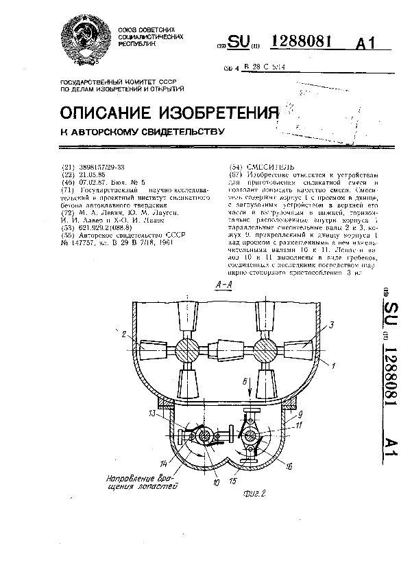 Смеситель / Левин М. А., Лауген Ю. М., Аавер И. И., Лаане Х-О. И.; заявитель: Государственный научно-исследовательский и проектный институт силикатного бетона автоклавного твердения // Описания изобретений (ретрофонд) / Комитет по патентам и товарным знакам России. – М., 2003. – 1987, № 1. — (Патенты России). — Загл. с титул. экрана. — Поисковая система: MIMOSA GTI. — Систем. требования: Acrobat Reader. — Режим доступа: ftp://smolensklib.ru/bd/patent_ru/pt1288081.pdf. — <URL:ftp://smolensklib.ru/bd/patent_ru/pt1288081.pdf>.