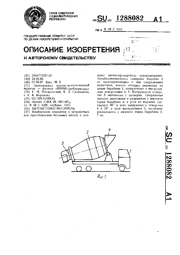 Автобетоносмеситель / Плавельский Е. П., Семенченко В. З., Воронова А. А.; заявитель: Центральный научно-испытательный полигон - филиал «ВНИИстройдормаша» // Описания изобретений (ретрофонд) / Комитет по патентам и товарным знакам России. – М., 2003. – 1987, № 1. — (Патенты России). — Загл. с титул. экрана. — Поисковая система: MIMOSA GTI. — Систем. требования: Acrobat Reader. — Режим доступа: ftp://smolensklib.ru/bd/patent_ru/pt1288082.pdf. — <URL:ftp://smolensklib.ru/bd/patent_ru/pt1288082.pdf>.