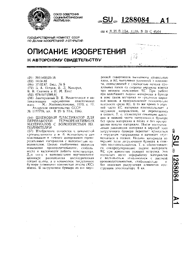 Шнековый пластикатор для переработки термореактивных материалов с волокнистым наполнителем / Петров Б. А., Макаров В. Л., Скачков В. В., Котт И. М. // Описания изобретений (ретрофонд) / Комитет по патентам и товарным знакам России. – М., 2003. – 1987, № 1. — (Патенты России). — Загл. с титул. экрана. — Поисковая система: MIMOSA GTI. — Систем. требования: Acrobat Reader. — Режим доступа: ftp://smolensklib.ru/bd/patent_ru/pt1288084.pdf. — <URL:ftp://smolensklib.ru/bd/patent_ru/pt1288084.pdf>.