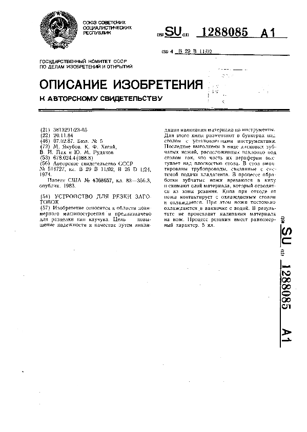 Устройство для резки заготовок / Якубов М., Хегай К. Ф., Пак В. И., Рудаков Ю. М. // Описания изобретений (ретрофонд) / Комитет по патентам и товарным знакам России. – М., 2003. – 1987, № 1. — (Патенты России). — Загл. с титул. экрана. — Поисковая система: MIMOSA GTI. — Систем. требования: Acrobat Reader. — Режим доступа: ftp://smolensklib.ru/bd/patent_ru/pt1288085.pdf. — <URL:ftp://smolensklib.ru/bd/patent_ru/pt1288085.pdf>.