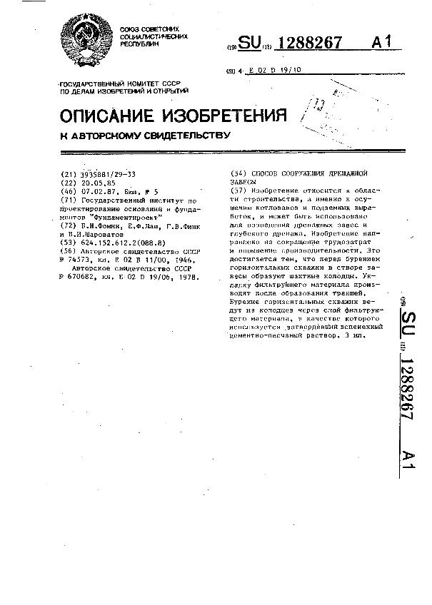 Способ сооружения дренажной завесы / Фомин Б. Н., Лаш Е. Ф., Финк Г. В., Шароватов В. И.; заявитель: Государственный институт по проектированию оснований и фундаментов "Фундаментпроект" // Описания изобретений (ретрофонд) / Комитет по патентам и товарным знакам России. – М., 2003. – 1987, № 1. — (Патенты России). — Загл. с титул. экрана. — Поисковая система: MIMOSA GTI. — Систем. требования: Acrobat Reader. — Режим доступа: ftp://smolensklib.ru/bd/patent_ru/pt1288267.pdf. — <URL:ftp://smolensklib.ru/bd/patent_ru/pt1288267.pdf>.