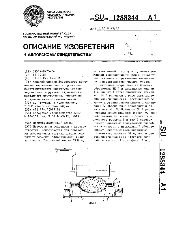 Перистальтический насос / Трухан В. Г., Демидович В. М., Стайченко Е. С., Цвирко М. А.; заявитель: Минский филиал Всесоюзного научно-исследовательского и проектно-конструкторского института механизированного и ручного строительно-монтажного инструмента, вибраторов и строительно-отделочных машин // Описания изобретений (ретрофонд) / Комитет по патентам и товарным знакам России. – М., 2003. – 1987, № 1. — (Патенты России). — Загл. с титул. экрана. — Поисковая система: MIMOSA GTI. — Систем. требования: Acrobat Reader. — Режим доступа: ftp://smolensklib.ru/bd/patent_ru/pt1288344.pdf. — <URL:ftp://smolensklib.ru/bd/patent_ru/pt1288344.pdf>.