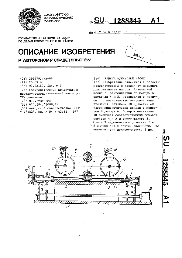 Перистальтический насос / Румянцев М. С.; заявитель: Государственный проектный и научно-исследовательский институт "Гипроникель" // Описания изобретений (ретрофонд) / Комитет по патентам и товарным знакам России. – М., 2003. – 1987, № 1. — (Патенты России). — Загл. с титул. экрана. — Поисковая система: MIMOSA GTI. — Систем. требования: Acrobat Reader. — Режим доступа: ftp://smolensklib.ru/bd/patent_ru/pt1288345.pdf. — <URL:ftp://smolensklib.ru/bd/patent_ru/pt1288345.pdf>.