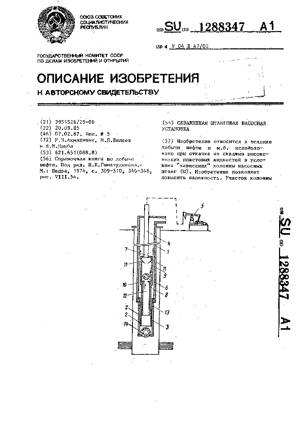 Скважинная штанговая насосная установка / Ахмадишин Р. З., Валеев М. Д., Дзюба В. И. // Описания изобретений (ретрофонд) / Комитет по патентам и товарным знакам России. – М., 2003. – 1987, № 1. — (Патенты России). — Загл. с титул. экрана. — Поисковая система: MIMOSA GTI. — Систем. требования: Acrobat Reader. — Режим доступа: ftp://smolensklib.ru/bd/patent_ru/pt1288347.pdf. — <URL:ftp://smolensklib.ru/bd/patent_ru/pt1288347.pdf>.