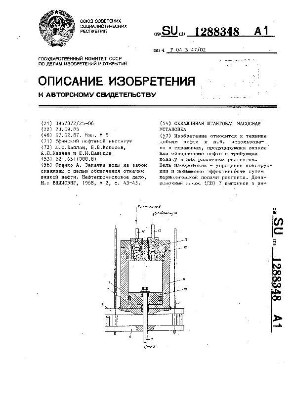 Скважинная штанговая насосная установка / Каплан Л. С., Колосов Б. В., Каплан А. Л., Давыдов Е. И.; заявитель: Уфимский нефтяной институт // Описания изобретений (ретрофонд) / Комитет по патентам и товарным знакам России. – М., 2003. – 1987, № 1. — (Патенты России). — Загл. с титул. экрана. — Поисковая система: MIMOSA GTI. — Систем. требования: Acrobat Reader. — Режим доступа: ftp://smolensklib.ru/bd/patent_ru/pt1288348.pdf. — <URL:ftp://smolensklib.ru/bd/patent_ru/pt1288348.pdf>.