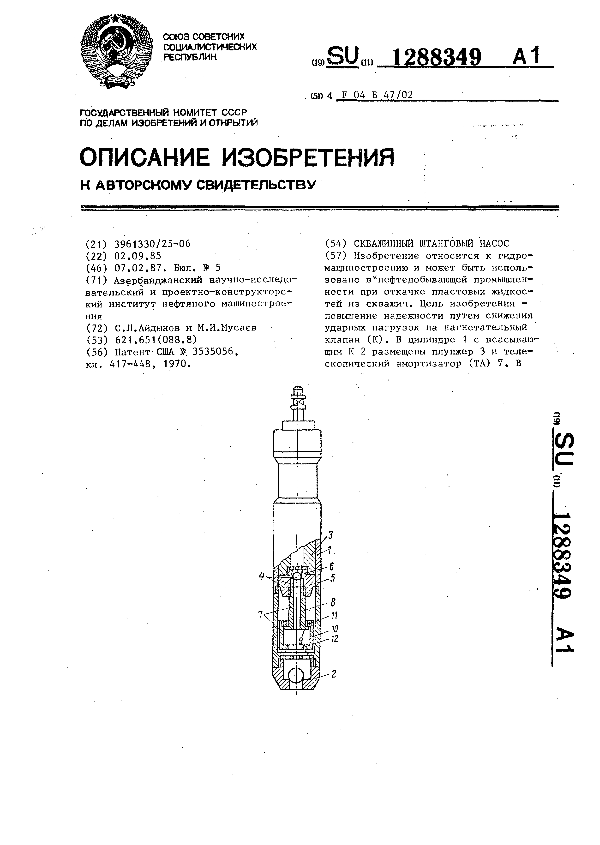 Скважинный штанговый насос / Айдынов С. Л., Мусаев М. И.; заявитель: Азербайджанский научно-исследовательский и проектно-конструкторский институт нефтяного машиностроения // Описания изобретений (ретрофонд) / Комитет по патентам и товарным знакам России. – М., 2003. – 1987, № 1. — (Патенты России). — Загл. с титул. экрана. — Поисковая система: MIMOSA GTI. — Систем. требования: Acrobat Reader. — Режим доступа: ftp://smolensklib.ru/bd/patent_ru/pt1288349.pdf. — <URL:ftp://smolensklib.ru/bd/patent_ru/pt1288349.pdf>.