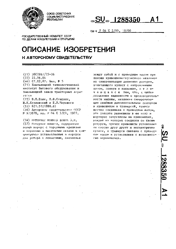 Роторная машина Вовка В. П. / Вовк В. П., Стадник Я. Ф., Козловский Ю. К., Черешнев Е. Л.; заявитель: Хмельницкий технологический институт бытового обслуживания, Хмельницкий завод тракторных агрегатов // Описания изобретений (ретрофонд) / Комитет по патентам и товарным знакам России. – М., 2003. – 1987, № 1. — (Патенты России). — Загл. с титул. экрана. — Поисковая система: MIMOSA GTI. — Систем. требования: Acrobat Reader. — Режим доступа: ftp://smolensklib.ru/bd/patent_ru/pt1288350.pdf. — <URL:ftp://smolensklib.ru/bd/patent_ru/pt1288350.pdf>.