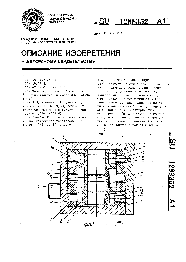 Шестеренная гидромашина / Пилипенко В. И., Чичиков Г. Л., Матюшкин А. М. [и др.]; заявитель: Производственное объединение "Минский тракторный завод им. В. И. Ленина" // Описания изобретений (ретрофонд) / Комитет по патентам и товарным знакам России. – М., 2003. – 1987, № 1. — (Патенты России). — Загл. с титул. экрана. — Поисковая система: MIMOSA GTI. — Систем. требования: Acrobat Reader. — Режим доступа: ftp://smolensklib.ru/bd/patent_ru/pt1288352.pdf. — <URL:ftp://smolensklib.ru/bd/patent_ru/pt1288352.pdf>.