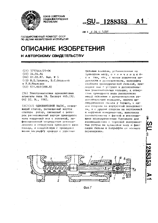 Одновинтовой насос / Кулаков М. Х., Ольховой В. С., Ильясаев Е. И. // Описания изобретений (ретрофонд) / Комитет по патентам и товарным знакам России. – М., 2003. – 1987, № 1. — (Патенты России). — Загл. с титул. экрана. — Поисковая система: MIMOSA GTI. — Систем. требования: Acrobat Reader. — Режим доступа: ftp://smolensklib.ru/bd/patent_ru/pt1288353.pdf. — <URL:ftp://smolensklib.ru/bd/patent_ru/pt1288353.pdf>.