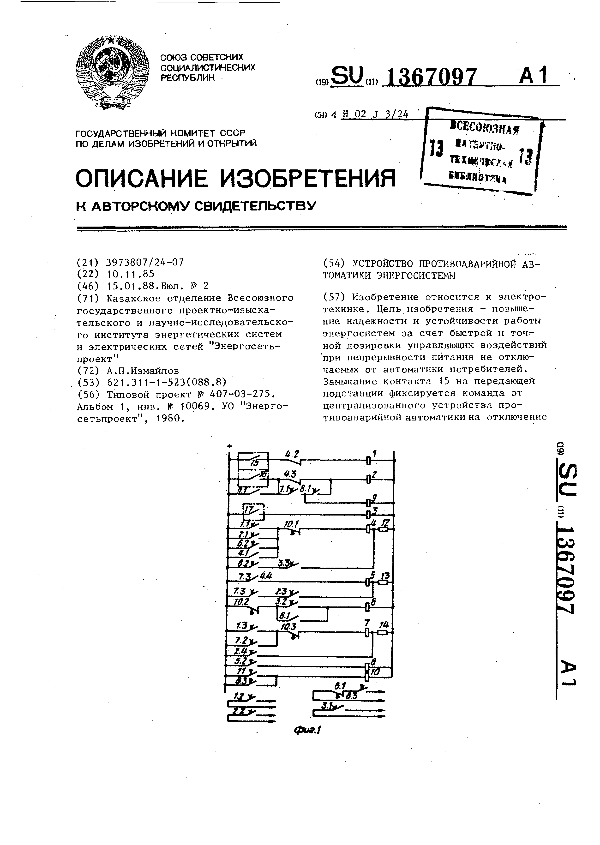 Устройство противоаварийной автоматики энергосистемы / Измайлов А. П.; заявитель: Казахское отделение Всесоюзного государственного проектно-изыскательского и научно-исследовательского института энергетических системи электрических сетей "Энергосеть- проект" // Описания изобретений (ретрофонд) / Комитет по патентам и товарным знакам России. — М., 1994-____. — (Патенты России). – 1988, № 1. — Загл. с титул. экрана. — Поисковая система: ИПС MIMOSA GTI. — Систем. требования: Acrobat Reader. — Режим доступа: ftp://smolensklib.ru/bd/patent_ru/pt1367097.pdf. — <URL:ftp://smolensklib.ru/bd/patent_ru/pt1367097.pdf>.