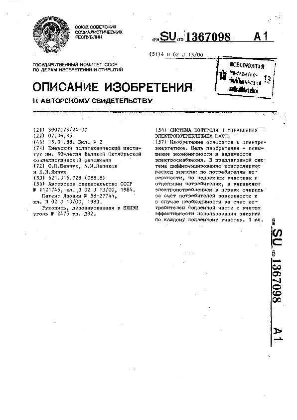 Система контроля и управления электропотреблением шахты / Шевчук С. П., Лепихов А. И., Янчук Е. Н.; заявитель: Киевский политехнический институт им. 50-летия Великой Октябрьской социалистической революции // Описания изобретений (ретрофонд) / Комитет по патентам и товарным знакам России. — М., 1994-____. — (Патенты России). – 1988, № 1. — Загл. с титул. экрана. — Поисковая система: ИПС MIMOSA GTI. — Систем. требования: Acrobat Reader. — Режим доступа: ftp://smolensklib.ru/bd/patent_ru/pt1367098.pdf. — <URL:ftp://smolensklib.ru/bd/patent_ru/pt1367098.pdf>.