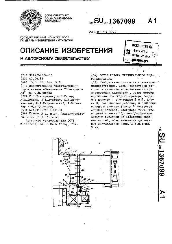 Остов ротора вертикального гидрогенератора / Виноградов Е. Н., Папер А. С., Прядко А. И. [и др.]; заявитель: Ленинградское электромашиностроительное объединение "Электросила" им. С.М.Кирова // Описания изобретений (ретрофонд) / Комитет по патентам и товарным знакам России. — М., 1994-____. — (Патенты России). – 1988, № 1. — Загл. с титул. экрана. — Поисковая система: ИПС MIMOSA GTI. — Систем. требования: Acrobat Reader. — Режим доступа: ftp://smolensklib.ru/bd/patent_ru/pt1367099.pdf. — <URL:ftp://smolensklib.ru/bd/patent_ru/pt1367099.pdf>.