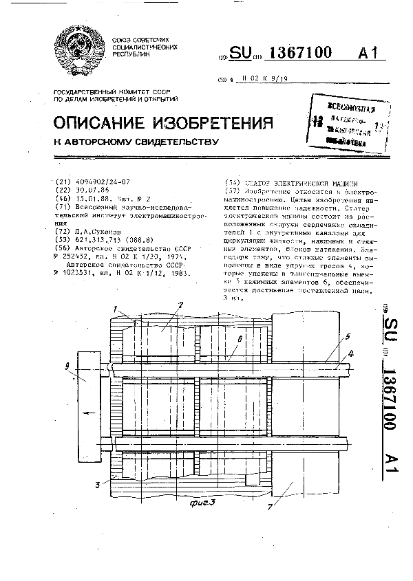 Статор электрической машины / Суханов Л. А.; заявитель: Всесоюзный научно-исследовательский институт электромашиностроения // Описания изобретений (ретрофонд) / Комитет по патентам и товарным знакам России. — М., 1994-____. — (Патенты России). – 1988, № 1. — Загл. с титул. экрана. — Поисковая система: ИПС MIMOSA GTI. — Систем. требования: Acrobat Reader. — Режим доступа: ftp://smolensklib.ru/bd/patent_ru/pt1367100.pdf. — <URL:ftp://smolensklib.ru/bd/patent_ru/pt1367100.pdf>.