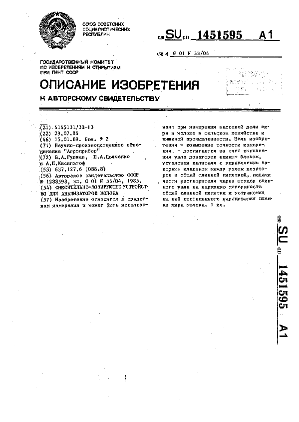 Смесительно-дозирующее устройство для анализаторов молока / Гуляев В. А., Дьяченко Л. А., Кисильгоф А. И.; заявитель: Научно-производственное объединение "Агроприбор" // Описания изобретений (ретрофонд) / Комитет по патентам и товарным знакам России. – М., 2003. – 1989, № 1. — (Патенты России). — Загл. с титул. экрана. — Поисковая система: ИПС MIMOSA GTI. — Систем. требования: Acrobat Reader. — Режим доступа: ftp://smolensklib.ru/bd/patent_ru/pt1451595.pdf. — <URL:ftp://smolensklib.ru/bd/patent_ru/pt1451595.pdf>.