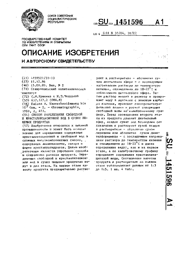 Способ определения свободной и кристаллизационной вод в сухих пищевых продуктах / Кунижев С. М., Чепурной И. П.; заявитель: Ставропольский политехнический институт // Описания изобретений (ретрофонд) / Комитет по патентам и товарным знакам России. – М., 2003. – 1989, № 1. — (Патенты России). — Загл. с титул. экрана. — Поисковая система: ИПС MIMOSA GTI. — Систем. требования: Acrobat Reader. — Режим доступа: ftp://smolensklib.ru/bd/patent_ru/pt1451596.pdf. — <URL:ftp://smolensklib.ru/bd/patent_ru/pt1451596.pdf>.