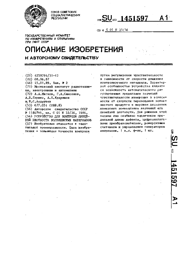 Устройство для контроля линейной плотности волокнистых материалов / Мягков А. А., Самсонов Г. А., Глушко А. Б. [и др.]; заявитель: Московский институт радиотехники, электроники и автоматики // Описания изобретений (ретрофонд) / Комитет по патентам и товарным знакам России. – М., 2003. – 1989, № 1. — (Патенты России). — Загл. с титул. экрана. — Поисковая система: ИПС MIMOSA GTI. — Систем. требования: Acrobat Reader. — Режим доступа: ftp://smolensklib.ru/bd/patent_ru/pt1451597.pdf. — <URL:ftp://smolensklib.ru/bd/patent_ru/pt1451597.pdf>.