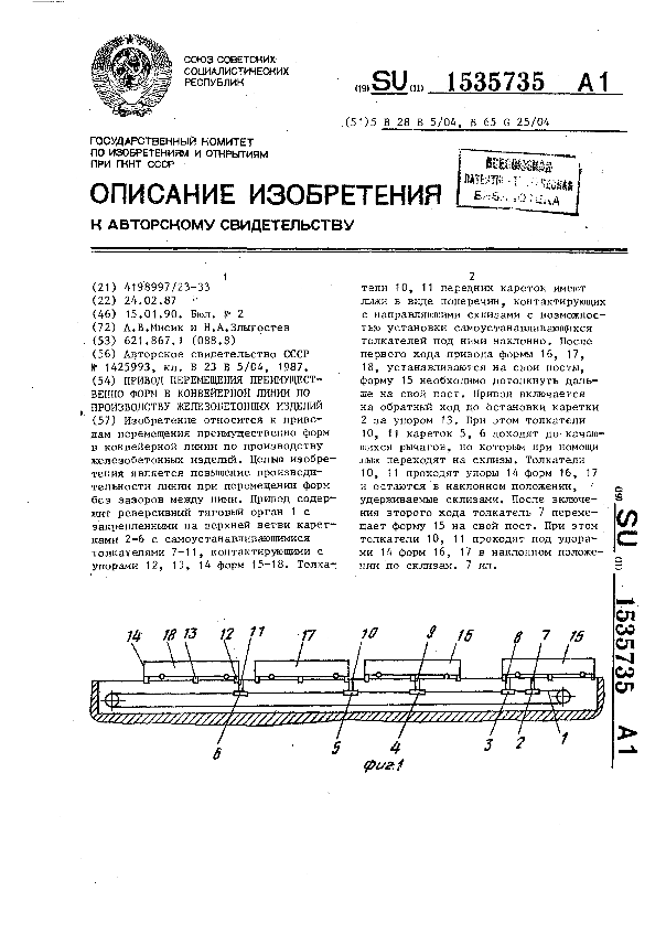 Привод перемещения преимущественно форм в конвейерной линии по производству железобетонных изделий / Мисик А. В., Злыгостев Н. А. // Описания изобретений (ретрофонд) / Комитет по патентам и товарным знакам России. – М., 2003. – 1990, № 1. — (Патенты России). — Загл. с титул. экрана. — Поисковая система: MIMOSA GTI. — Систем. требования: Acrobat Reader. — Режим доступа: ftp://smolensklib.ru/bd/patent_ru/pt1535735.pdf. — <URL:ftp://smolensklib.ru/bd/patent_ru/pt1535735.pdf>.