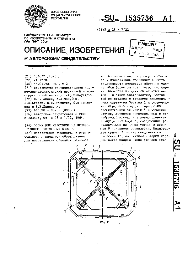 Форма для изготовления железобетонных пустотелых блоков / Зайцев В. И., Манухин А. А., Егоров В. В. [и др.]; заявитель: Всесоюзный государственный научно-исследовательский проектный и конструкторский институт стройиндустрии // Описания изобретений (ретрофонд) / Комитет по патентам и товарным знакам России. – М., 2003. – 1990, № 1. — (Патенты России). — Загл. с титул. экрана. — Поисковая система: MIMOSA GTI. — Систем. требования: Acrobat Reader. — Режим доступа: ftp://smolensklib.ru/bd/patent_ru/pt1535736.pdf. — <URL:ftp://smolensklib.ru/bd/patent_ru/pt1535736.pdf>.