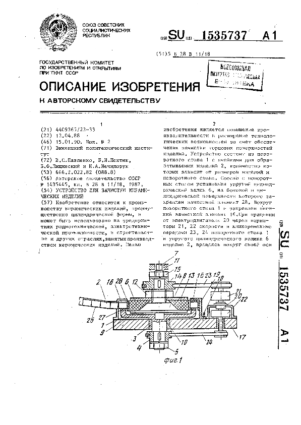 Устройство для зачистки керамических изделий / Павленко В. С., Пентюк Б. Н., Лищинский Б. Ф., Нечипорук Н. А.; заявитель: Винницкий политехнический институт // Описания изобретений (ретрофонд) / Комитет по патентам и товарным знакам России. – М., 2003. – 1990, № 1. — (Патенты России). — Загл. с титул. экрана. — Поисковая система: MIMOSA GTI. — Систем. требования: Acrobat Reader. — Режим доступа: ftp://smolensklib.ru/bd/patent_ru/pt1535737.pdf. — <URL:ftp://smolensklib.ru/bd/patent_ru/pt1535737.pdf>.