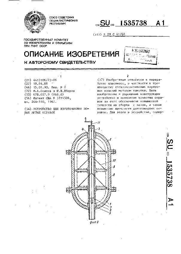 Устройство для изготовления полых литых оправок / Осипов М. А., Яборов Ю. Н. // Описания изобретений (ретрофонд) / Комитет по патентам и товарным знакам России. – М., 2003. – 1990, № 1. — (Патенты России). — Загл. с титул. экрана. — Поисковая система: MIMOSA GTI. — Систем. требования: Acrobat Reader. — Режим доступа: ftp://smolensklib.ru/bd/patent_ru/pt1535738.pdf. — <URL:ftp://smolensklib.ru/bd/patent_ru/pt1535738.pdf>.