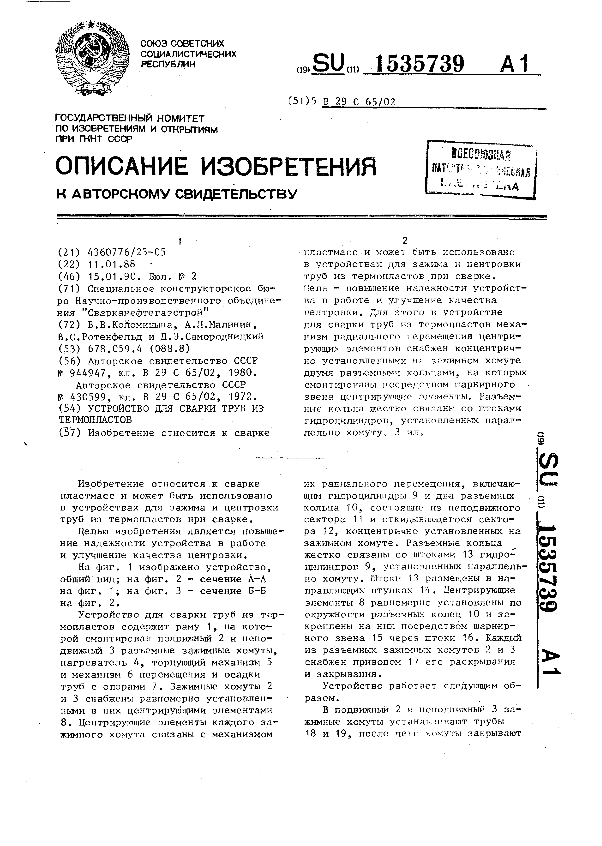 Устройство для сварки труб из термопластов / Коломицына В. В., Малинин А. Л., Ротенфельд В. С., Самородницкий Д. Э.; заявитель: Специальное конструкторское бюро Научно-производственного объединения "Сварканефтегазстрой" // Описания изобретений (ретрофонд) / Комитет по патентам и товарным знакам России. – М., 2003. – 1990, № 1. — (Патенты России). — Загл. с титул. экрана. — Поисковая система: MIMOSA GTI. — Систем. требования: Acrobat Reader. — Режим доступа: ftp://smolensklib.ru/bd/patent_ru/pt1535739.pdf. — <URL:ftp://smolensklib.ru/bd/patent_ru/pt1535739.pdf>.