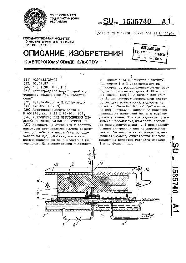 Устройство для изготовления изделий из вспенивающихся материалов / Цимберов Л. К., Перельник Л. И.; заявитель: Ленинградское научно-производственное объединение "Ленпроектмебель" // Описания изобретений (ретрофонд) / Комитет по патентам и товарным знакам России. – М., 2003. – 1990, № 1. — (Патенты России). — Загл. с титул. экрана. — Поисковая система: MIMOSA GTI. — Систем. требования: Acrobat Reader. — Режим доступа: ftp://smolensklib.ru/bd/patent_ru/pt1535740.pdf. — <URL:ftp://smolensklib.ru/bd/patent_ru/pt1535740.pdf>.