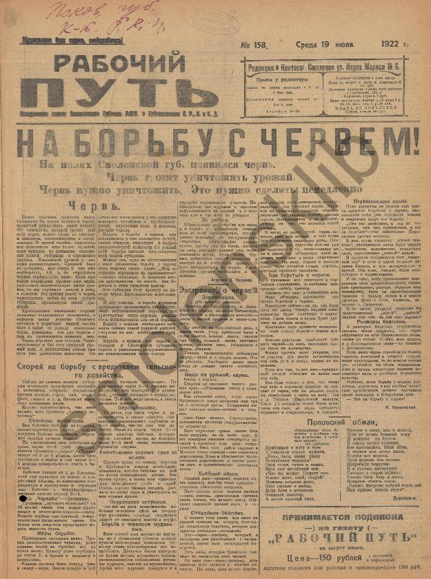 Рабочий путь / Орган Смоленского Губернского Комитета РКП(б) и Губисполкома Советов РК и КД. — Смоленск: 2-я тип. Совнархоза, 1920-____. № 150.