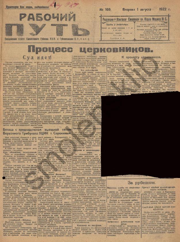 Рабочий путь / Орган Смоленского Губернского Комитета РКП(б) и Губисполкома Советов РК и КД. — Смоленск: 2-я тип. Совнархоза, 1920-____. № 169.