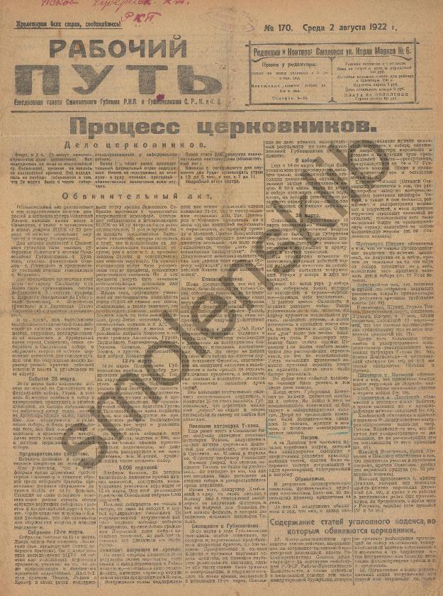 Рабочий путь / Орган Смоленского Губернского Комитета РКП(б) и Губисполкома Советов РК и КД. — Смоленск: 2-я тип. Совнархоза, 1920-____. № 170.