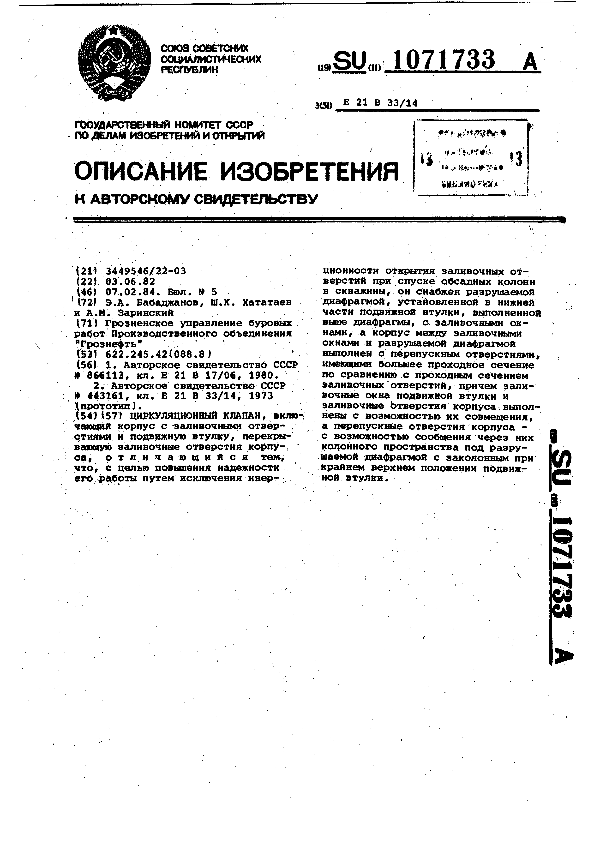 Циркуляционный клапан / Бабаджанов Э. А., Хататаев Ш. Х., Заринский А. М.; заявитель: Грозненское управление буровых работ Производственного объединения "Грознефть" // Описания изобретений (ретрофонд) / Комитет по патентам и товарным знакам России. – М. — (Патенты России)., 2003. – 1984, № 1. — Загл. с титул. экрана. — Поисковая система: ИПС MIMOSA GTI. — Систем. требования: Acrobat Reader. — Режим доступа: ftp://smolensklib.ru/bd/patent_ru/pt1071733.pdf. — <URL:ftp://smolensklib.ru/bd/patent_ru/pt1071733.pdf>.