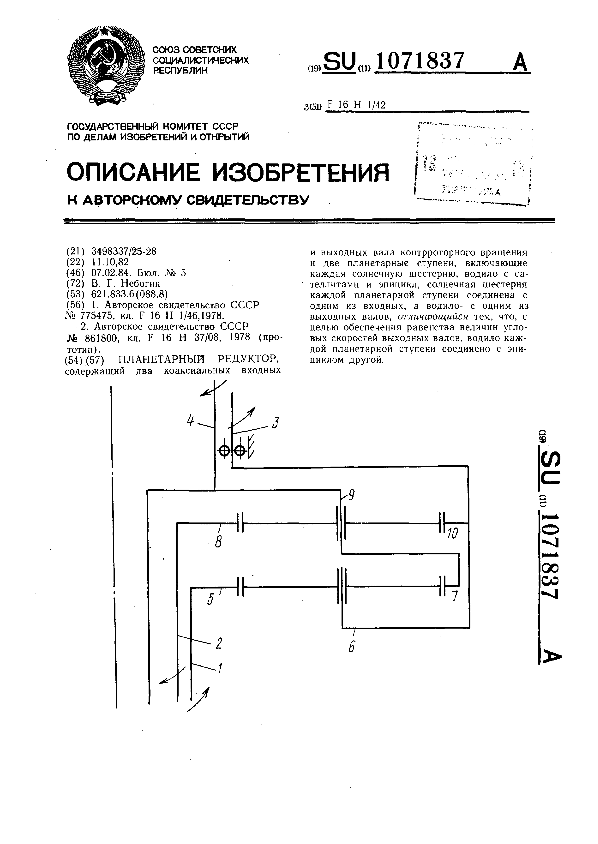 Планетарный редуктор / Небогин В. Г. // Описания изобретений (ретрофонд) / Комитет по патентам и товарным знакам России. – М. — (Патенты России)., 2003. – 1984, № 1. — Загл. с титул. экрана. — Поисковая система: ИПС MIMOSA GTI. — Систем. требования: Acrobat Reader. — Режим доступа: ftp://smolensklib.ru/bd/patent_ru/pt1071837.pdf. — <URL:ftp://smolensklib.ru/bd/patent_ru/pt1071837.pdf>.