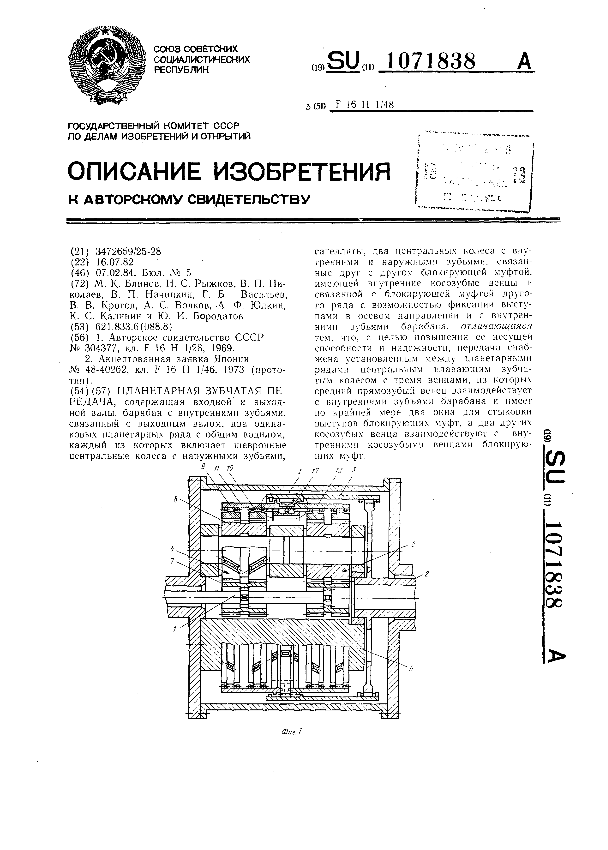 Планетарная зубчатая передача / Блинов М. К., Рыжков Н. С., Николаев В. П. [и др.] // Описания изобретений (ретрофонд) / Комитет по патентам и товарным знакам России. – М. — (Патенты России)., 2003. – 1984, № 1. — Загл. с титул. экрана. — Поисковая система: ИПС MIMOSA GTI. — Систем. требования: Acrobat Reader. — Режим доступа: ftp://smolensklib.ru/bd/patent_ru/pt1071838.pdf. — <URL:ftp://smolensklib.ru/bd/patent_ru/pt1071838.pdf>.