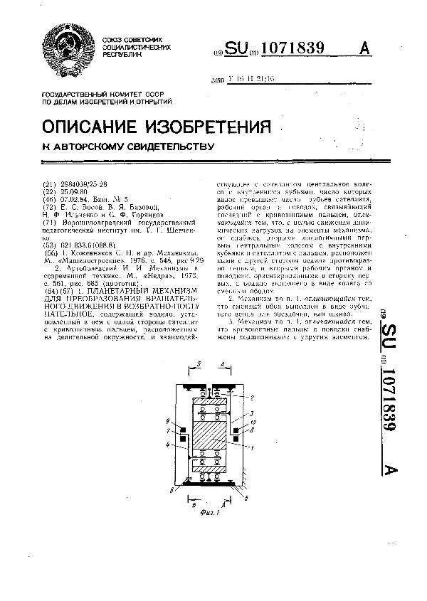 Планетарный механизм для преобразования вращательного движения в возвратно-поступательное / Босой Е. С., Базовой В. Я., Ильченко Н. Ф., Горяинов С. Ф.; заявитель: Ворошиловградский государственный педагогический институт им. Т. Г. Шевченко. // Описания изобретений (ретрофонд) / Комитет по патентам и товарным знакам России. – М. — (Патенты России)., 2003. – 1984, № 1. — Загл. с титул. экрана. — Поисковая система: ИПС MIMOSA GTI. — Систем. требования: Acrobat Reader. — Режим доступа: ftp://smolensklib.ru/bd/patent_ru/pt1071839.pdf. — <URL:ftp://smolensklib.ru/bd/patent_ru/pt1071839.pdf>.