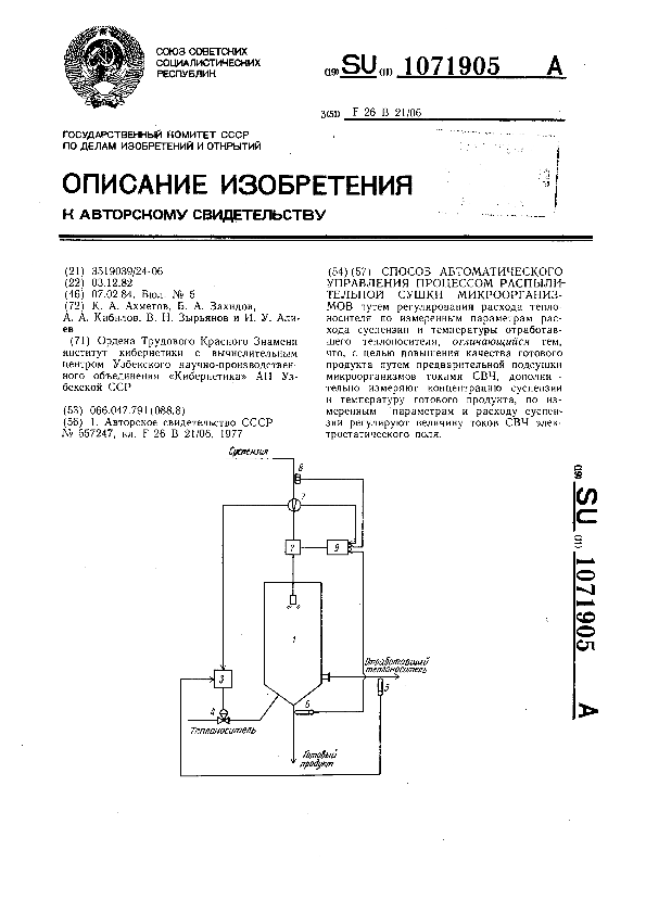 Способ автоматического управления процессом распылительной сушки микроорганизмов / Ахметов К. А., Захидов Б. А., Кабилов А. А. [и др.]; заявитель: Ордена Трудового Красного Знамени институт кибернетики с вычислительным центром Узбекского научно-производственного объединения «Кибернетика» АН Узбекской ССР // Описания изобретений (ретрофонд) / Комитет по патентам и товарным знакам России. – М. — (Патенты России)., 2003. – 1984, № 1. — Загл. с титул. экрана. — Поисковая система: ИПС MIMOSA GTI. — Систем. требования: Acrobat Reader. — Режим доступа: ftp://smolensklib.ru/bd/patent_ru/pt1071905.pdf. — <URL:ftp://smolensklib.ru/bd/patent_ru/pt1071905.pdf>.