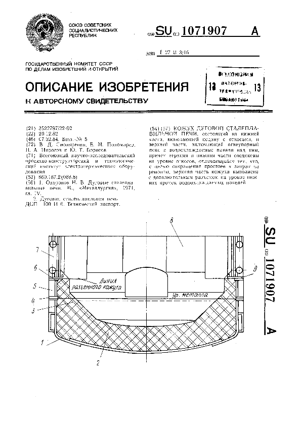 Кожух дуговой сталеплавильной печи / Смоляренко В. Д., Пономарев Е. М., Пирогов Н. А., Борисов Ю. Т.; заявитель: Всесоюзный научно-исследовательский проектно-конструкторский и технологическийинститут электротермического оборудования // Описания изобретений (ретрофонд) / Комитет по патентам и товарным знакам России. – М. — (Патенты России)., 2003. – 1984, № 1. — Загл. с титул. экрана. — Поисковая система: ИПС MIMOSA GTI. — Систем. требования: Acrobat Reader. — Режим доступа: ftp://smolensklib.ru/bd/patent_ru/pt1071907.pdf. — <URL:ftp://smolensklib.ru/bd/patent_ru/pt1071907.pdf>.